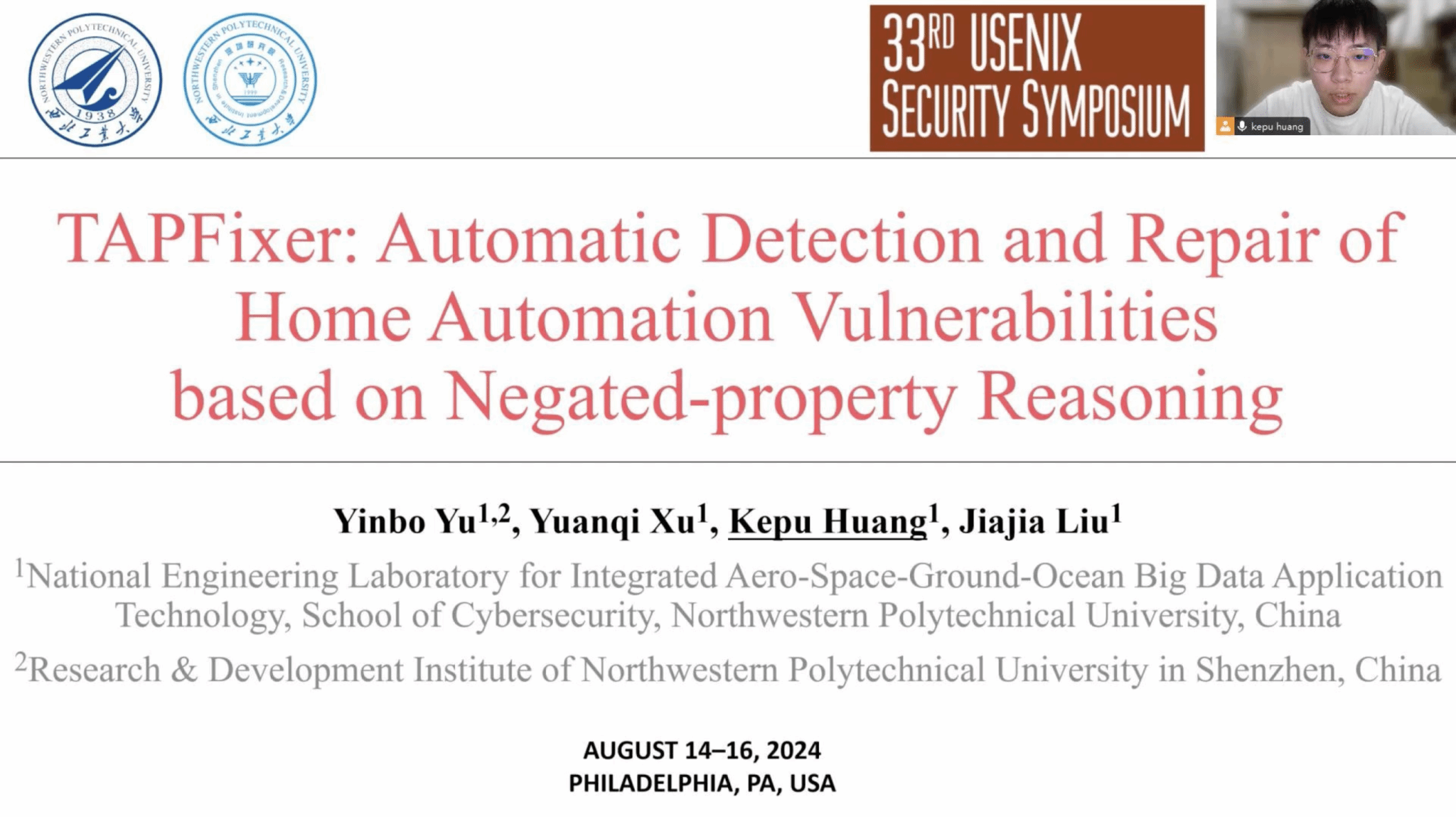 第33届国际网络安全顶会USENIX Security于2024年8月14日-16日在美国宾夕法尼亚州的费城召开。伟德BV1946官网于银菠副教授研究成果“TAPFixer: Automatic Detection and Repair of Home Automation Vulnerabilities based on Negated-property Reasoning”全文被USENIX Security大会正式发表,2023级硕士研究生黄柯蒲作大会报告。该论文是于银菠副教授专注于网络与软件安全领域研究所取得的重要成果之一,也是伟德BV1946官网第一篇作为第一完成单位的四大安全顶会文章。论文第一作者为于银菠副教授,2021级硕士研究生徐源琪和2023级硕士研究生黄柯蒲分别为员工第一作者和第二作者,刘家佳教授参与论文指导。