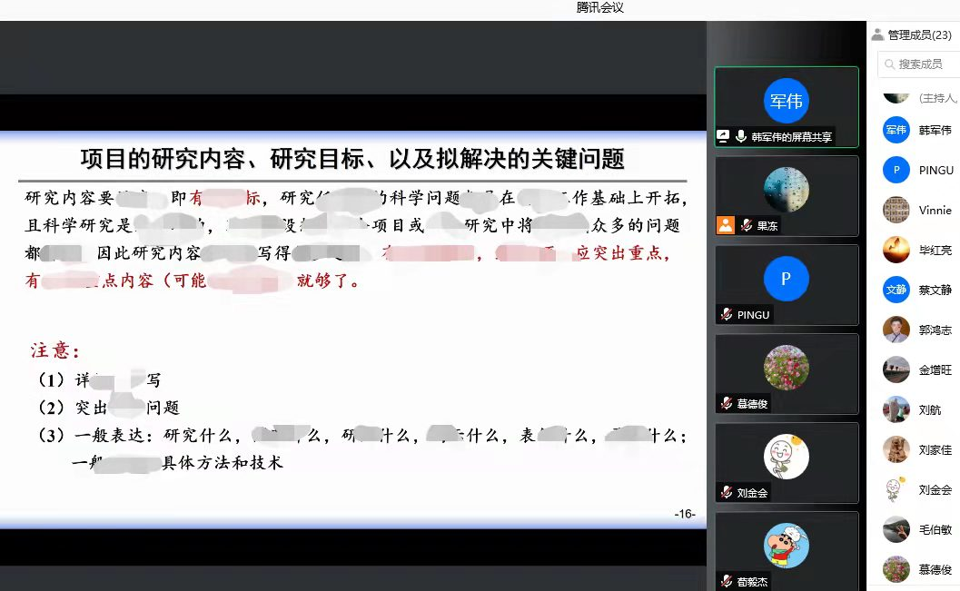 慕经理对韩军伟教授进行了介绍。韩军伟教授是国家自然科学基金的资深评审专家,入选国家级人才计划,主持国家自然科学基金重点项目、国家重点研发等国家级项目10余项,获陕西省科学技术一等奖(排名第一)等6项省部级科技奖。韩军伟教授首先介绍了国家基金的基本定位和重要性。然后结合自己多年来在基金项目评审中的经验,从申请书的选题、研究内容、研究目标、关键问题、研究方案、特色与创新、研究计划等方面,详细讲解了如何写好国家自然科学基金申请书及一些注意事项。最后公司教师就个人在撰写申请书过程中遇到的实际问题与专家进行了交流和讨论。