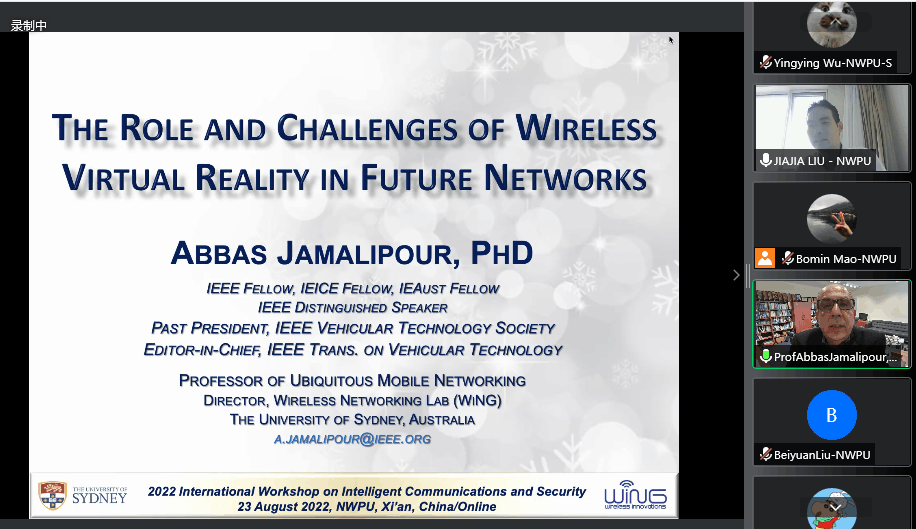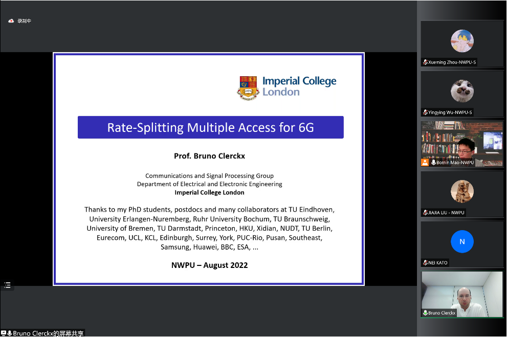 澳大利亚工程院院士、IEEE Fellow、悉尼大学Abbas Jamalipour教授做了题为“The Role and Challenges of Wireless Virtual Reality in Future Networks”的报告,围绕未来6G时代虚拟现实技术要求、挑战和安全风险进行了深入浅出的讲解;日本工程院院士、IEEE Fellow、日本东北大学NeiKato教授做了题为“6G Technologies for Supporting Smart IoT: Future Perspective”的报告,针对6G时代物联网关键技术和架构进行了系统性的分析和展望;IEEE Fellow、英国帝国理工公司BrunoClerckx教授做了题为“Rate-Splitting Multiple Access for 6G”的报告,对RSMA(Rate-Splitting Multiple Access)的原理和应用进行了详细介绍。此外,公司毛伯敏教授以Intelligent Resource Allocation and Task Scheduling in 6G Edge Networks为主题、郭鸿志副教授以Multi-UAV Cooperative Communications and Computing in 5G Advanced and Beyond为主题、于银菠副教授以The Security of Control Logic in Software: From Tradition to Intelligence为主题、张尚伟副教授以Design and Optimization of RSMA for Coexisting HTC/MTC in 6G and Future Networks为主题、刘倍源副教授以Optimal Beamformer Design for Millimeter Wave Dual-Functional Radar-Communication Based V2X Systems为主题、徐赛副教授以Intelligent Reflecting Surface Backscatter Communications为主题分别作了学术报告。