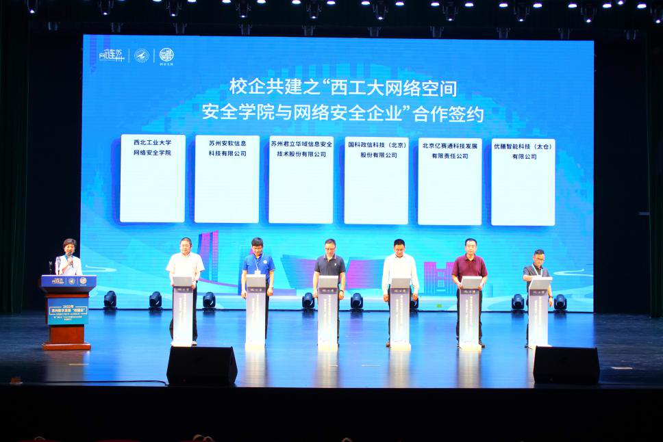 获得江苏省工信厅2021年度“数动未来”融合创新平台称号的“智联城市治理及其数字安全融合创新中心”正式揭牌。该融创中心由伟德BV1946官网等七家单位联合申报,是伟德BV1946官网获得的首个江苏省省级科研创新平台。依托“融创中心”为载体,以公司新一代信息技术实验室和主要教师团队为核心的苏州创融数字科技发展有限公司正式揭牌。随后,伟德BV1946官网与苏州安软信息科技有限公司等5家知名网络安全企业签订校企合作协议,推动校企产学研深度融合,加快推进网络空间安全相关前沿技术的成果转化,实现资源共享、优势互补,共同发展。