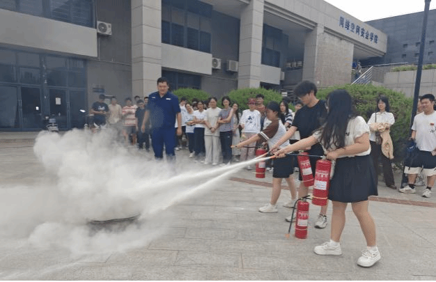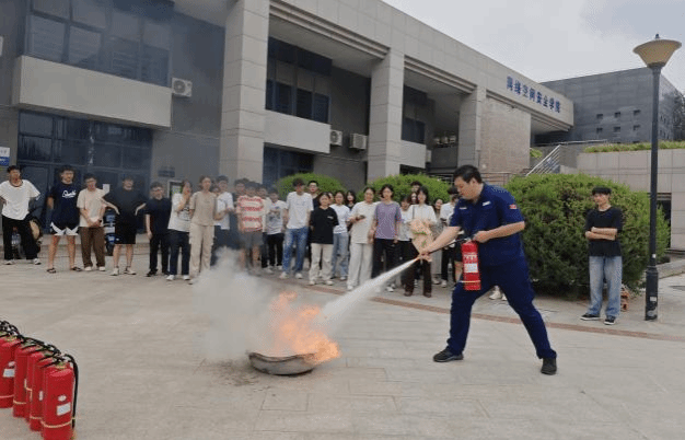 灭火实操环节,许磊老师现场演示了干粉灭火器的正确使用方法,并详细讲解了“提拔握压”的四步操作法。随后,师生们分组进行实战演练,在模拟火源前反复练习灭火动作。通过实际操作,大家不仅掌握了灭火器的使用方法,还增强了应对突发火情的信心和能力。
