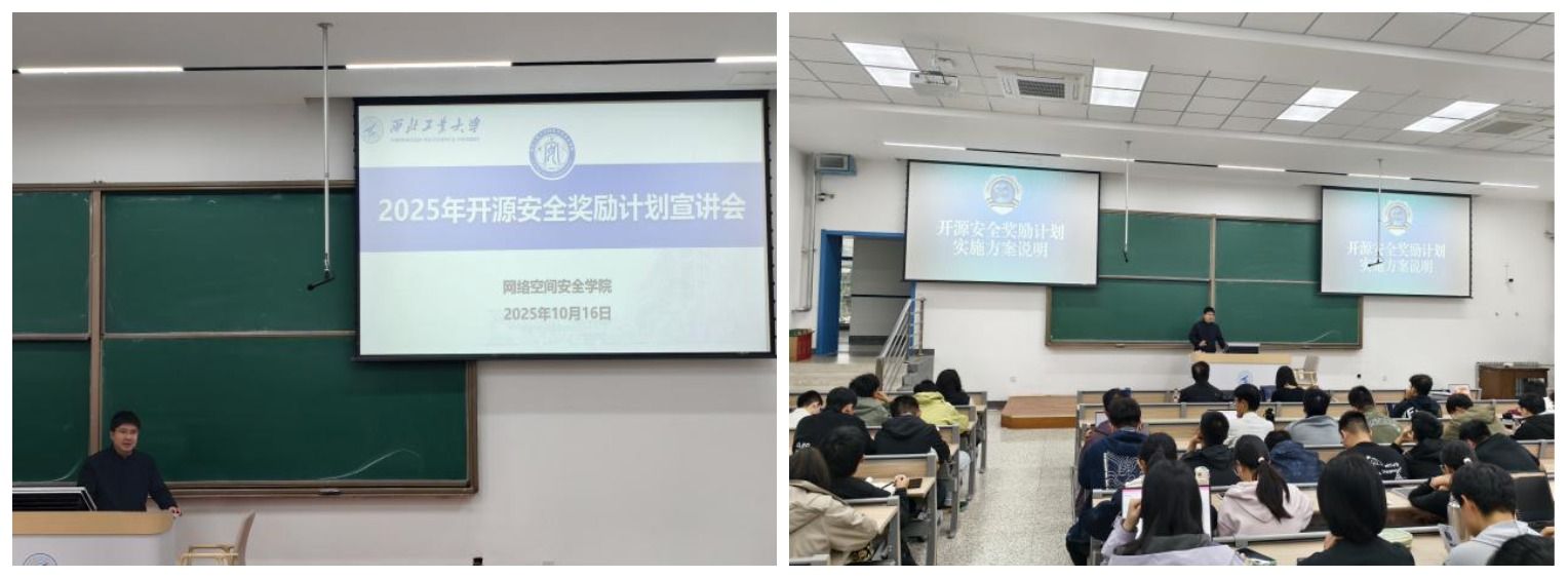 一流网安专项工作办公室主任胡伟教授对2025年开源安全奖励计划的报名规则、参与方式与具体流程进行了细致解读,并针对原创开源软件、开源漏洞挖掘、开源软件重写、国内开源社区贡献四大赛道的核心要求展开说明,有效帮助同学们深化了对计划的全面认知。此外,他提及公司已将各开源赛道成果纳入员工综合测评与教师工作量考核体系,更是进一步点燃了师生的参与热情。