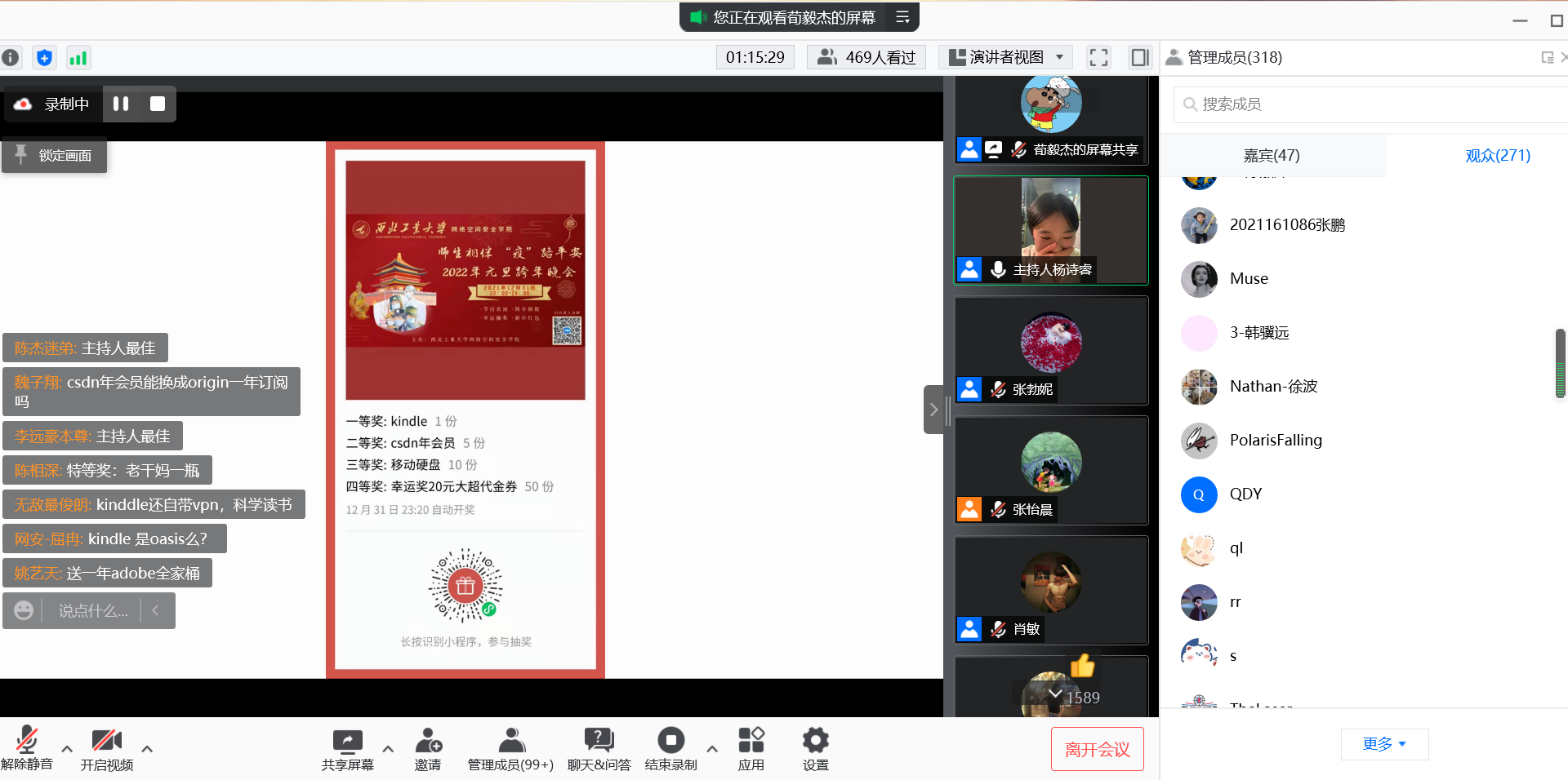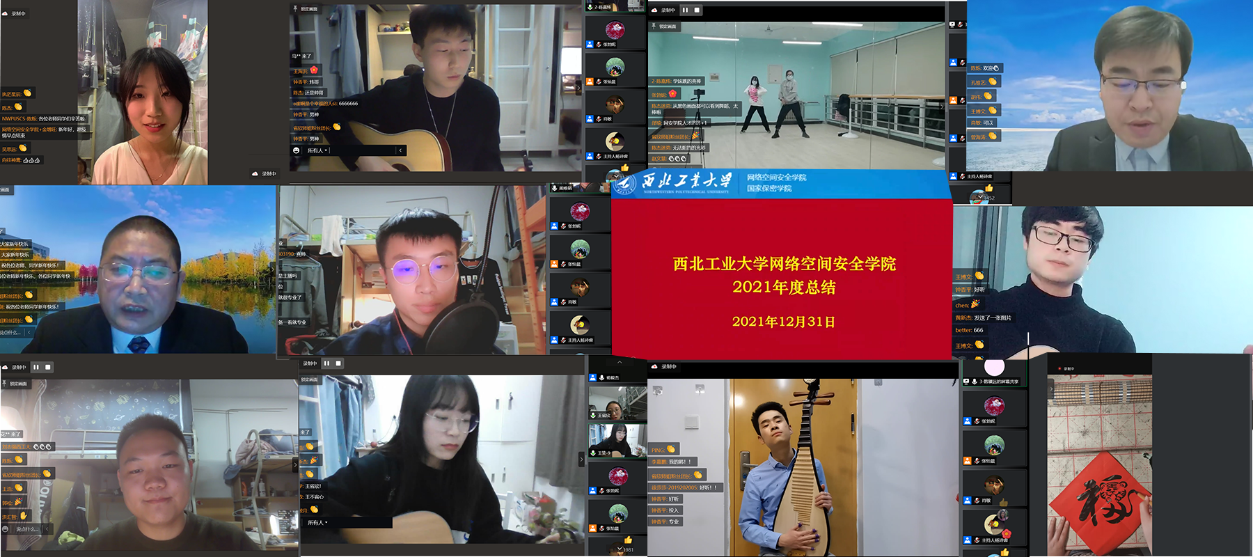 下半场,同学们带来的《孤勇者》、《经济舱》、《天外来物》将节目气氛又推向了新的高潮,辅导员节目,诗朗诵加弹唱《你的眼神,是夜空中最亮的星》、《致青春致梦想致奋斗》,通过以声传情,以情战“疫”,让我们致敬奋战在抗疫一线的最美身影,正是因为他们的默默付出,才让我们此刻能够安心地迎接新年的到来。两轮红包雨、最佳人气奖评选让师生心潮澎湃。公司年度总结视频播放、带领大家回顾了2021年度公司重点事件。