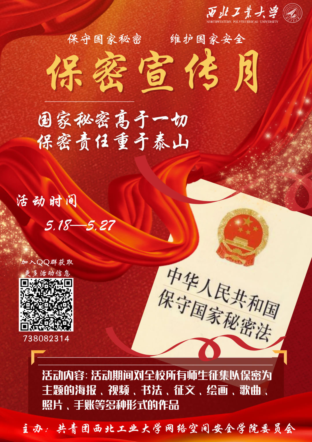 为提高全民保密意识,推动全民学习保密精神,我国将每年五月定为保密宣传月。今年五月是我国第34个保密宣传月,为深入贯彻落实习近平总书记关于保密工作重要指示批示精神,进一步筑牢保密防线,扎实做好保密工作,激发同学们树立保密意识、学习保密知识,伟德BV1946官网举行了参观学习、实地研学、主题讲座、青春讲堂、文艺作品征集等一系列保密主题活动。引导全校学子学习保密相关法律法规,强化保密意识,铸牢维护国家安全的精神防线。