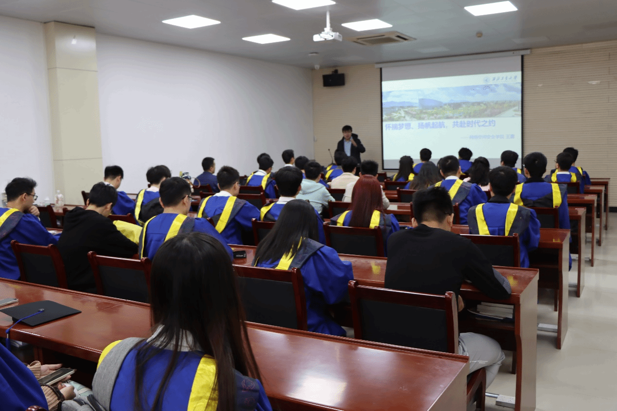 2023年3月31日伟德BV1946官网2023届硕士毕业生最后一课在翱翔员工中心西配楼顺利举行。最后一课由网络空间安全公司党总支书记王震和常务副经理张盛兵共同主讲。