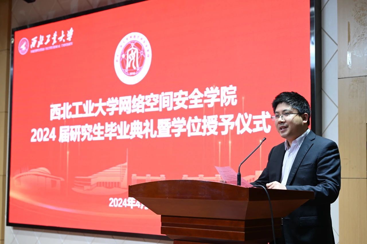 导师代表胡伟教授对即将毕业的同学们表达了最诚挚的祝福,并从“铸剑南山之下”“师出西岳之巅”“翱翔寰宇之内”“网安天下之际”四个方面表达了对2024届毕业生们的肯定、赞美、鼓励和希望。勉励大家始终牢记没有网络安全就没有国家安全。西工大网安院永远是大家共同的家园,欢迎大家常回家看看。