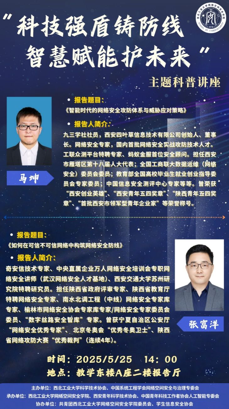 2025年5月24 至31日是第二十五个全国科技活动周,5月30日是第九个全国科技工作者日。为深入学习贯彻习近平总书记关于科技创新和网络强国的重要论述,加快提升网络安全高素质人才培养,伟德BV1946官网联合中国系统工程学会网络空间安全与治理专委会、西安青年科学技术协会、中国青年科技工作者协会人工智能专委会将于2025年5月25日14:00在伟德BV1946官网长安校区教学东楼A座二楼报告厅开展“科技强盾铸防线,智慧赋能护未来”主题科普活动。该活动旨在通过科普讲座等形式,普及网络安全攻防体系,助力筑牢国家安全和社会稳定的科技防线,加快推进高水平科技自立自强和网安实战人才自主培养。