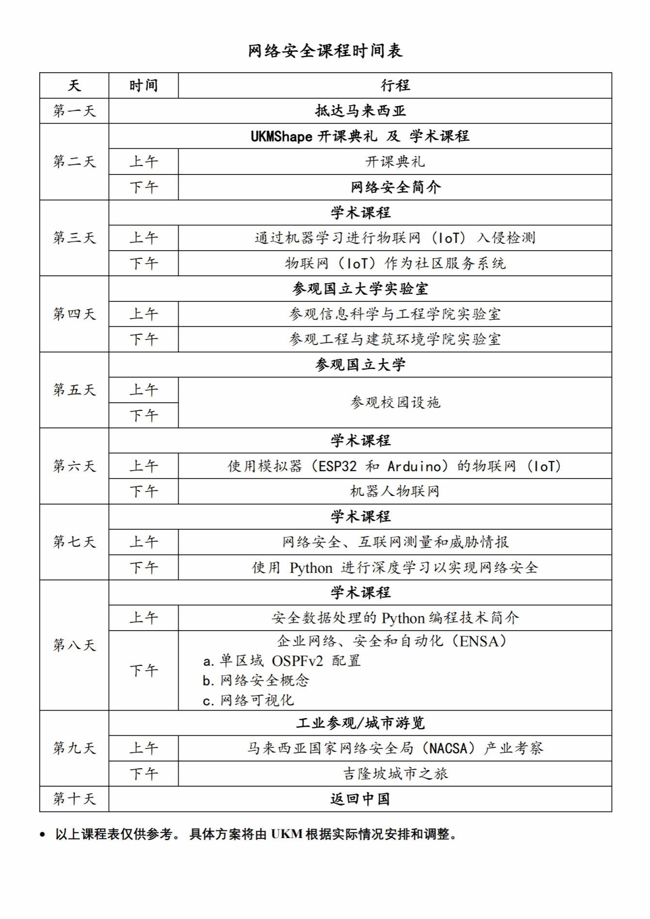 《网络安全》暑期访学项目,将由UKM信息科学与技术公司网络安全中心教授、专家承担教学工作,并组织员工参观网络安全实验室和美丽校园,并参访马来西亚国家网络安全局(NACSA)。马来西亚国立大学UKM自2000年开展计算机安全领域的研究,于2010年UKM已与马来西亚网络安全局CSM开展合作,2013年,UKM和CSM合作签署实施网络安全培养计划,开展网络安全硕士和网络安全专业认证课程。此外,UKM信息科学与技术公司FTSM与马来西亚皇家警察部PDRM和马来西亚SIRIM等其他利益相关者建立研究合作,UKM已成为马来西亚国家网络安全的守护者角色。