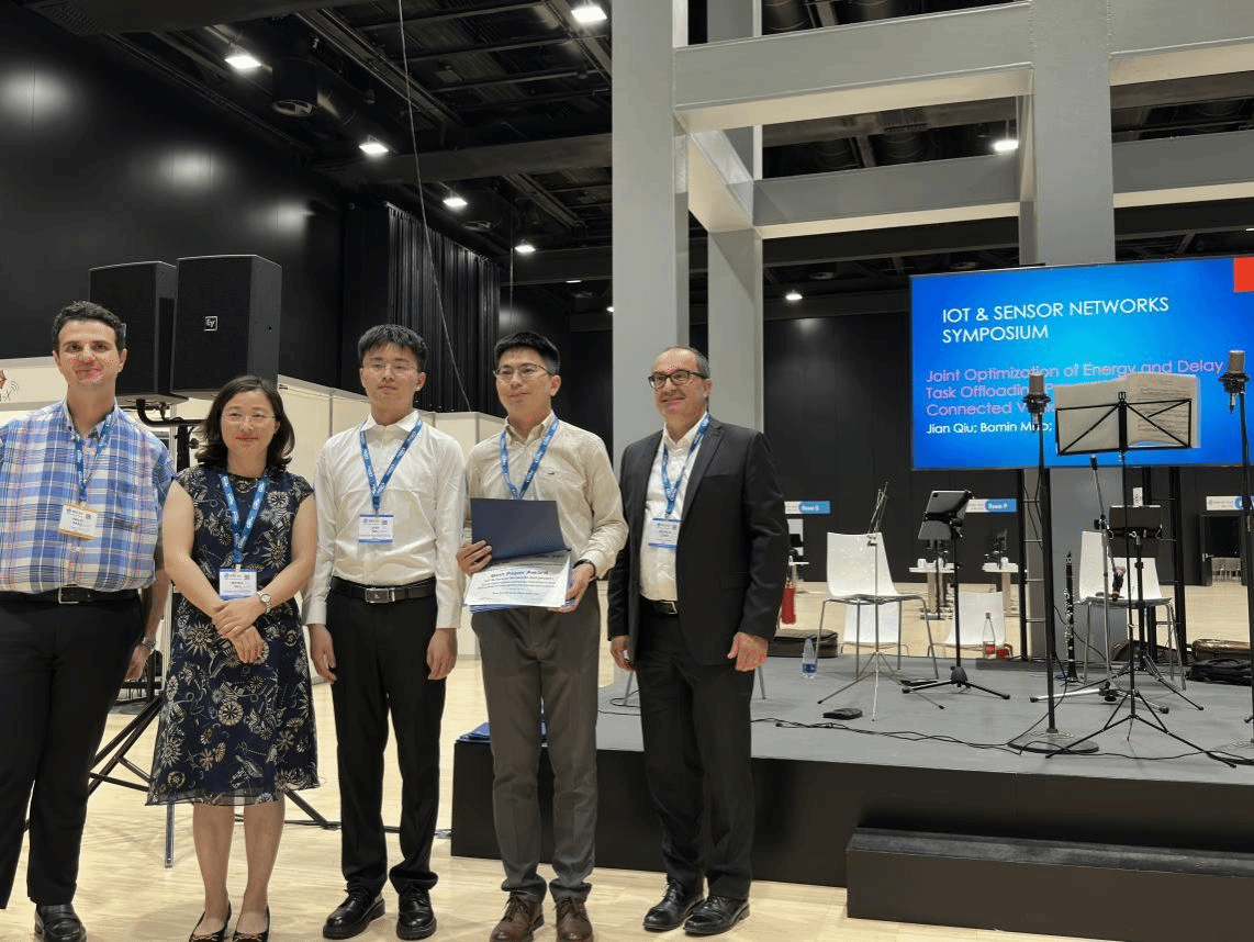 Professors Mao Bomin (second from the right) and Qiu Jian (third from the right) represented the team to receive the award at the IEEE ICC conference in Rome, Italy.