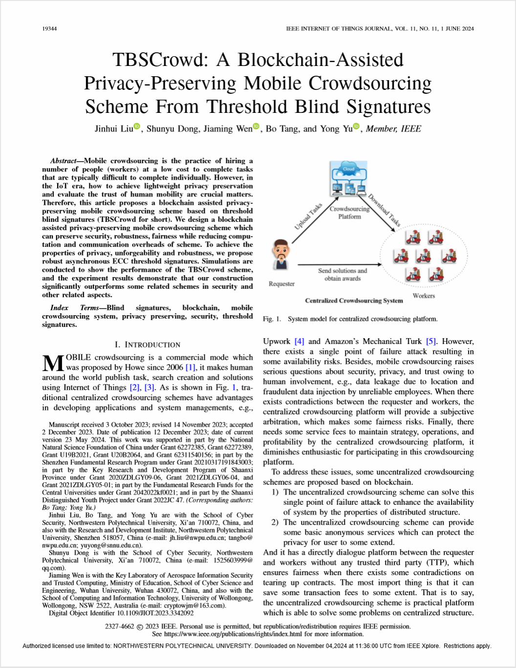Assisted Privacy-Preserving Mobile Crowdsourcing Scheme From Threshold Blind Signatures》员工一作,发表于IoTJ(中科院SCI一区)