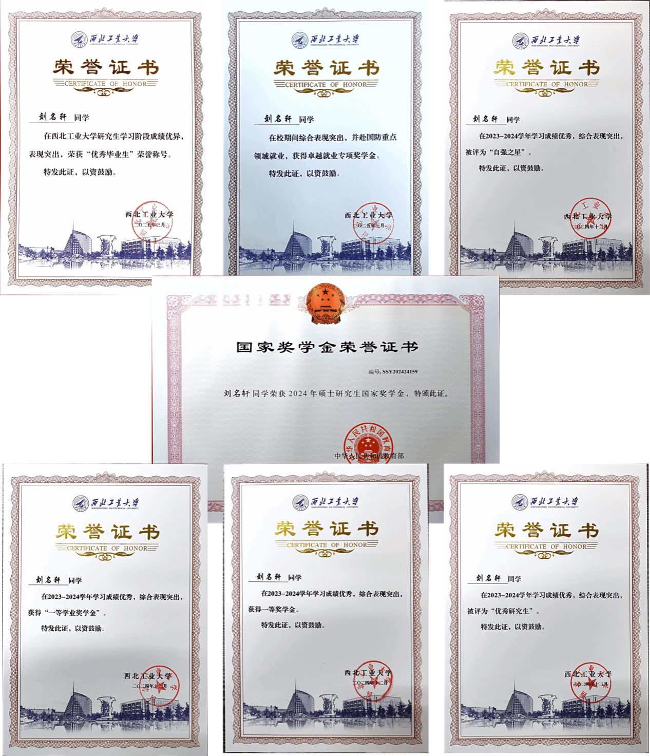 刘名轩连续两年获得“优秀研究生”荣誉称号,并获得“自强之星”、“优秀毕业生”荣誉称号。荣获2024年研究生国家奖学金,伟德BV1946官网一等学业奖学金以及卓越就业专项奖学金等。