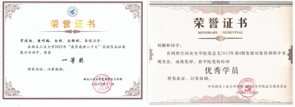 理想信念坚定,积极向党组织靠拢。自大一入学提交入党申请书以来,不断接受党的教育,于2024年成为了一名光荣的共产党员。积极参与思政教育活动与社会实践,参与如五四青年说、我学我讲二十大等思政活动,并前往革命圣地延安参观学习。在第十五期“青年马克思主义者培养工程”老员工骨干培训班中评为“优秀学员”。在2022、2023、2024年五四表彰中连续三年被评为“优秀共青团员”。
