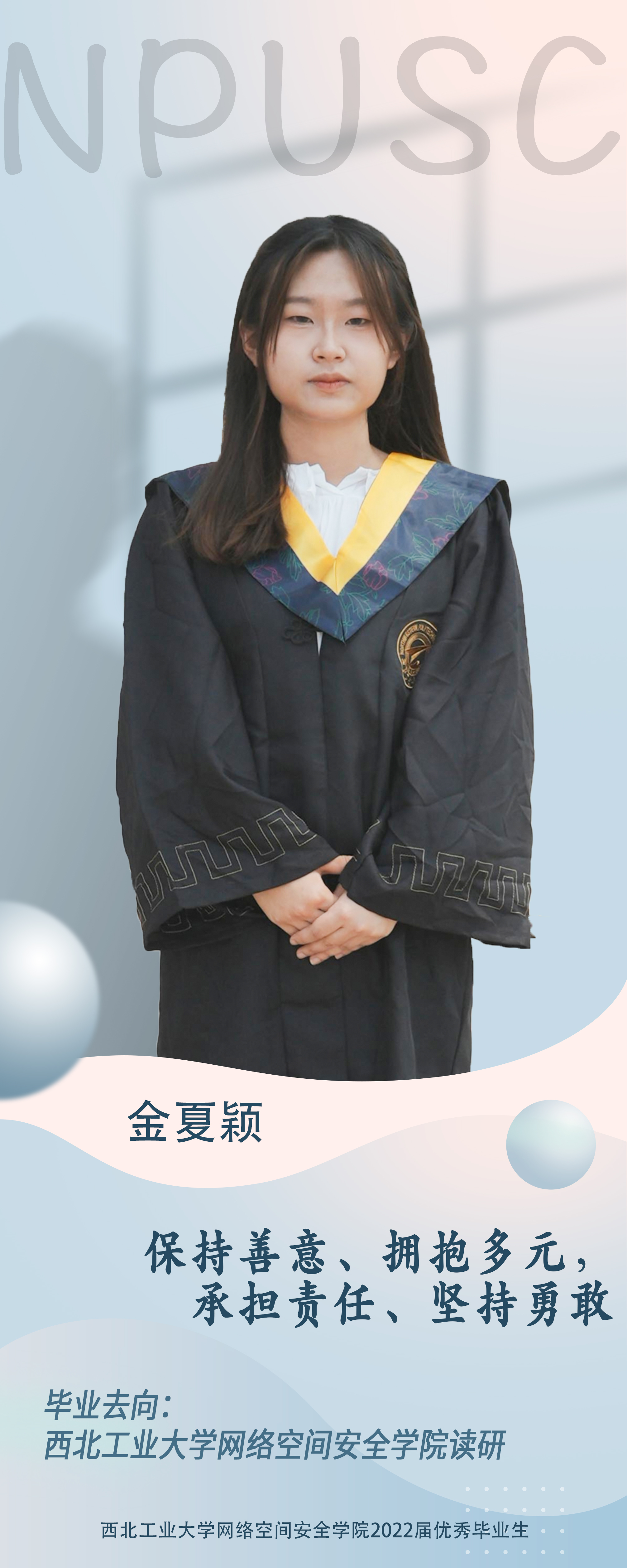 公司2018级本科生金夏颖,曾担任伟德BV1946官网员工会主席团成员、团委副书记,2018级SC011801团支部书记。曾获吴亚军三等专项奖学金1次;校优秀员工2次,院优秀员工1次;大一大二学年连续获得“校优秀共青团员”称号,大三学年获得“校优秀团干部”称号。连续三年担任小班团支书,所在团支部获得一次“先进团支部” 称号(公司唯一),大一学年担任大班团支书,大三学年担任公司团委副书记。累计获得国际性奖项1项,国家级奖项2项,校级奖项8项,中国机器人大赛无人机挑战赛全国一等奖、全国老员工信息安全作品赛一等奖等;积极参加志愿活动,例如“回母校宣讲活动”、“80周年校庆活动”(获得“校优秀志愿者”称号)。