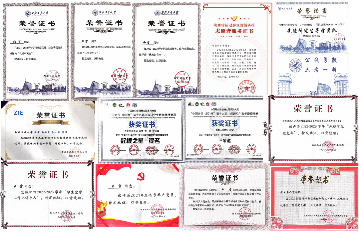她正视困难、求实奋进,成绩始终位于专业前10%,连续两年获评伟德BV1946官网“优秀研究生”,获校级奖学金。面向国家安全重大战略需求,在导师和团队老师引领、同门配合下,曲雪积极参与科学研究,参加国家重点课题2项,发表论文2篇,专利1项,软著1项。同时,参与教材编写,担任本科生专业课程助教,并踊跃参加实习实践交流活动,不断更新知识、拓宽视野,提升自身能力。此外,曲雪多次参加学科竞赛并均取得优异成绩。在第十九届“华为杯”研究生数学建模竞赛中从近1万8千支队伍中脱颖而出,获国家一等奖(获奖比例为1.10%),中兴专项一等奖(仅两队),数模之星提名奖(获奖比例为0.067%)。