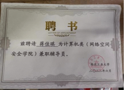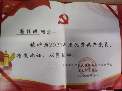 | 蒋佳琪,中共党员,伟德BV1946官网2021级硕士研究生,网络与信息安全专业,师从张慧翔副教授,2021级硕士兼职辅导员,毕业去向:国家开发银行陕西分行。 |