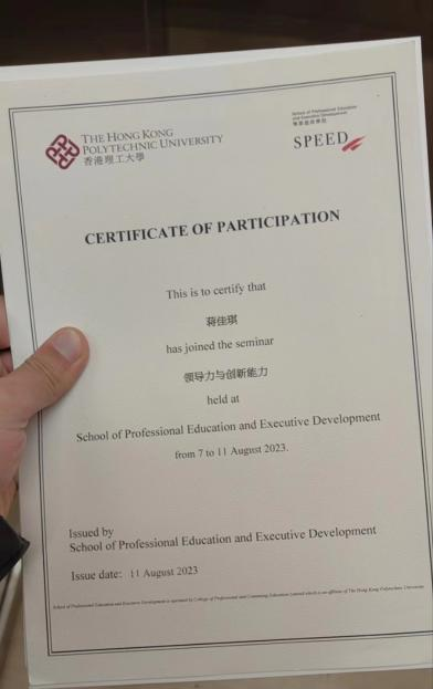 2023年7月,赴香港参加优秀兼职辅导员领导力与创新能力提升实践研学活动,在香港理工大学与多位名师学者面对面交流探讨,在研学中充实本领,提升综合能力。