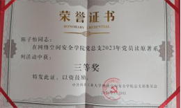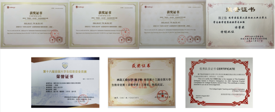 除了课程的学习,陈子怡同学在竞赛方面追逐自己的热爱,以赛促学,多维度多方面的提升能力。她大一便斩获全国老员工英语竞赛特等奖,参与全国总决赛的演讲和风采大赛并获三等奖;多次获得外研社国才杯写作阅读大赛初赛一等奖;曾获全国老员工数学竞赛三等奖。在胡伟老师的指导下,作为团队队长,她带领队员获得全国老员工信息安全作品赛二等奖,项目同时申请软著一项。