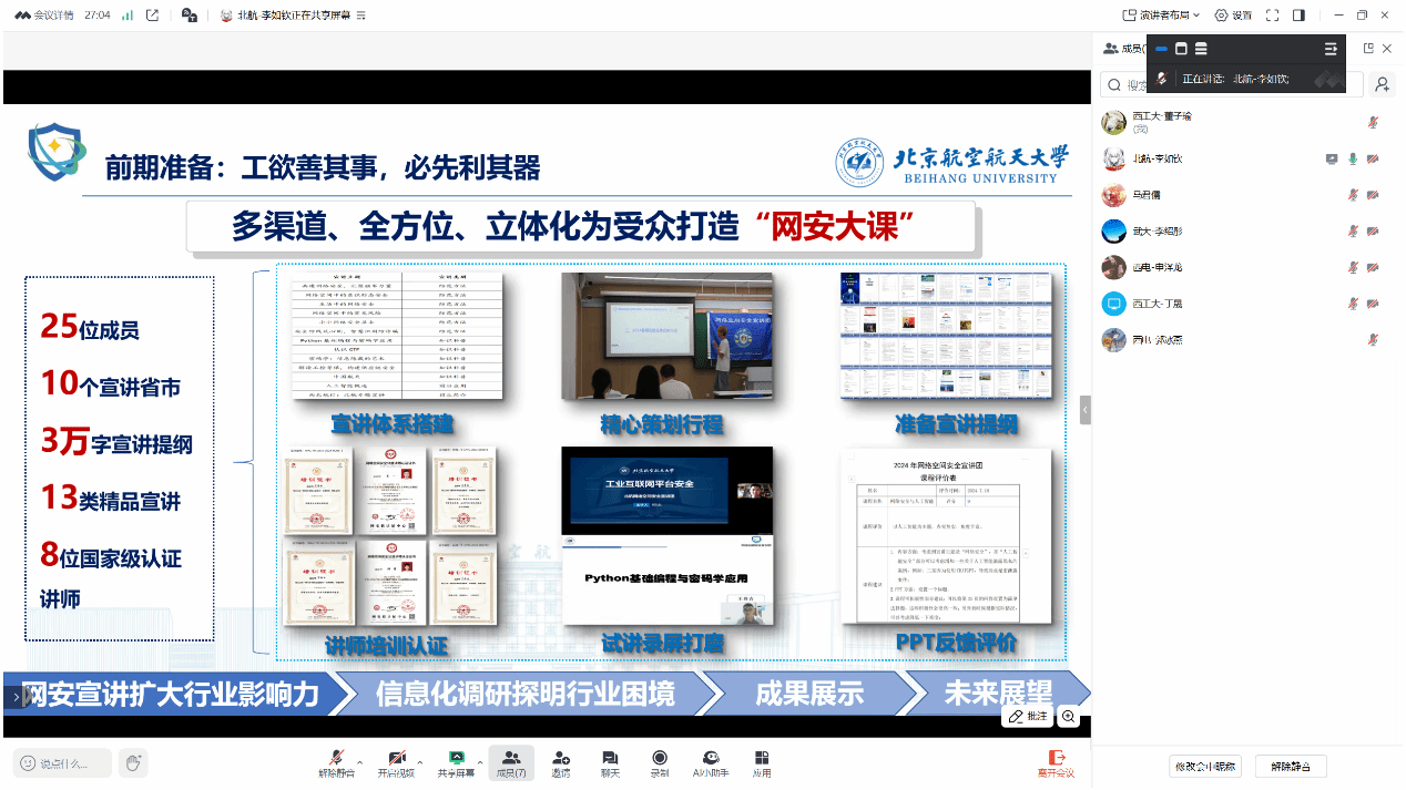 紧接着,北京航空航天大学伟德BV1946官网主席团成员李如钦介绍了北航伟德BV1946官网员工会在2024年度的各项工作成果。在主席团的统筹协调下,员工会各部门分工合作,成功举办了多项与校员工会、北京学联的联合活动,创新性地开展了航空航天嘉年华等特色活动,极大丰富了同学们的校园文化生活。同时,北航的网络空间安全宣讲团在暑假期间走进了多个省市,开展了广泛而深入的宣讲活动,同时也围绕网络安全行业的落地现状进行了调研,为全国多个地方建立网络空间安全基地,提高了公众的网络安全意识。此外还在科技成果和宣传活动方面有所建树。