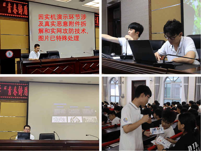 薛沛元通过案例讲解诈骗套路,现场演示恶意附件拆解,剖析了当前网络诈骗高发手段。吴炳良和付宇轩联袂展示模拟实网攻防技术,解析恶意链接生成与植入机制,演示绕过防火墙、控制终端设备的过程。姜懿恒聚焦密码技术,结合凯撒密码等知识,用编程语言演示破解过程,在实践中解释密码学原理。队员们通过典型案例、技术演示,不仅有效提升了青少年的诈骗防范意识与识别能力,还进一步激发他们对网络安全技术的兴趣与探索欲。