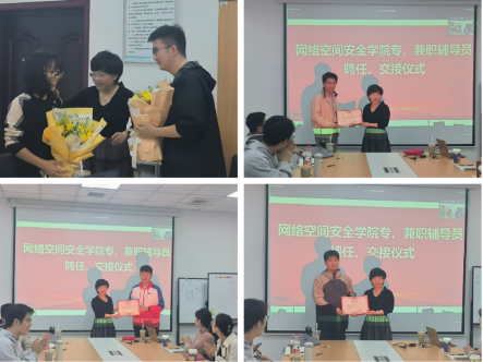 在专兼职辅导员的聘任交接会上,完成辅导员聘期的青年教师刘金会、研究生付强和戴佳怡,分别对辅导员工作经历进行了申请回顾和总结,表示将全力配合做好工作交接,并衷心祝愿公司员工工作蒸蒸日上。杜瑶代表公司向三位同志赠送了鲜花,衷心感谢他们对公司人才培养工作作出的重要贡献。为新加入学工团队的青年教授毛伯敏、研究生张昊翔和张钦尧颁发了辅导员岗位聘书。