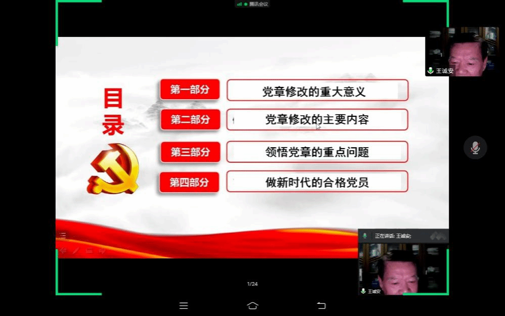 第一部分,王教授从历史和现实角度讲述党章修改的重大意义,他强调,党章是党内的根本大法,是全党必须遵守的最高行为规范。第二部分,王教授主要讲述了党章修改的五十个地方。第三部分,王教授详细介绍了党章的基本结构,通过十个方面让我们对党章的主线有了更加深入的学习和了解,包括关于党的性质、关于党的纲领、关于党的指导思想、关于党的宗旨、关于党的使命任务和方针政策、关于党的建设的基本要求、关于党员的义务和权利、关于党的组织制度和组织体系、关于党的干部、关于党的纪律十个方面的内容,王教授表示抓住了这十个方面的内容就抓住了党章的主线。第四部分,王教授强调了党章是全面从严治党的总依据和总遵循,也是全体党员的总规矩和总遵循。无论党员干部还是普通党员,要做合格党员,学习贯彻党章都是第一位的要求,并从四个方面对我们如何做新时代合格党员提出要求。